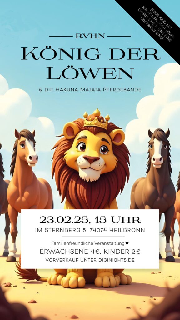Dieses Jahr hat sich der Reiterverein Heilbronn wieder mal etwas Besonderes für seine Pferdemarktshow einfallen lassen. Unter der Leitung von Tessa Pfeifer und Alexa Egerer wird am 23.02.2025 um 15 Uhr „König der Löwen & die Hakuna Matata Pferdebande“ aufgeführt. Dieses Jahr hat der Reiterverein Heilbronn einige Gaststars eingeladen. Eine kleine süße Überraschung wird es für Kinder geben, die mit einer Krone bekleidet sind, oder einen Löwen mitbringen. Karten gibt es im Vorverkauf bei Diginights (Klick aufs Bild). Für das leibliche Wohl ist gesorgt.