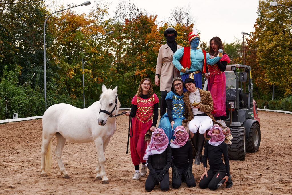 Glückliche Kinderaugen gabs auf dem Herbstfest des Reiterverein Heilbronn. Begonnen hat das Herbstfest mit einer Kinderrallye. Hier durften die Kinder sich im Eierlaufen, Sackhüpfen, Malen und einem Pferdequiz austoben. Anschließend fand in der großen Halle die Reitshow „Ein Traum wird wahr. Aladdins Reise zum wahren Reichtum“ statt. Mehr als 280 Karten wurden für die Show verkauft. Die Zuschauer waren angetan von der liebevoll gestalteten Show. So erschien beispielsweise „Genie“ (Kendra Wolff), der Geist aus der Wunderlampe, unter lautem Knallen und in blauem Nebel plötzlich in der Halle. Besonderer Höhepunkt war für viele Kinder tatsächlich der „Fliegende Teppich“. Auf diesem schwebte Aladdin (Tessa Pfeifer) in die Halle, holte dort seine Prinzessin Jasmin (Alexa Egerer) ab, um anschließend gemeinsam glücklich aus der Halle zu fliegen. Im Anschluß wurde mit einem lachenden und einem weinenden Augen das langjährige Schulpony „Steffi“ in den wohlverdienten Ruhestand verabschiedet. Danach durften die Kinder, sowie die Erwachsenen, mit den Märchenfiguren ihrer Wahl Bilder machen. Da war dann auch der Zeitpunkt gekommen, dass es sich die Familien am großen Lagerfeuer gemütlich machen konnten. Das war die Gelegenheit mit den Kindern Marshmallows zu grillen, Wurst, Pommes oder Waffeln zu genießen. Fazit: ein gelungener Familiennachmittag.