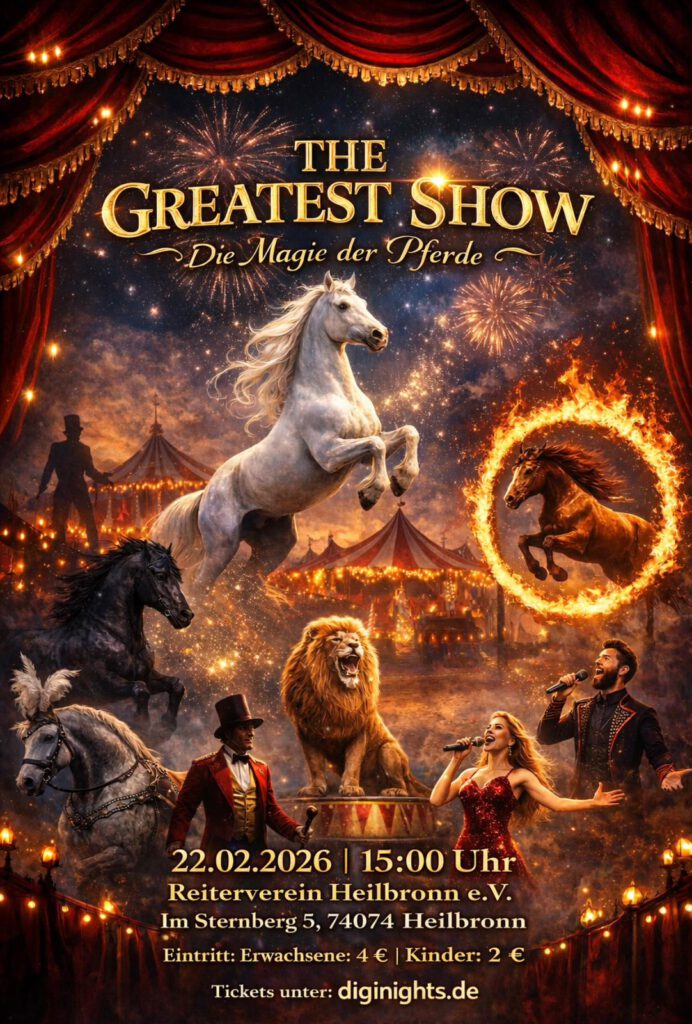Im Rahmen des Heilbronner Pferdemarkts zeigt der Reiterverein Heilbronn e.V. seine traditionelle Reitshow. Dieses Mal unter dem Titel „THE GREATEST SHOW – Die Magie der Pferde -„. Für das leibliche Wohl wird gesorgt sein. Zu den Tickets geht’s im nachstehenden Link.