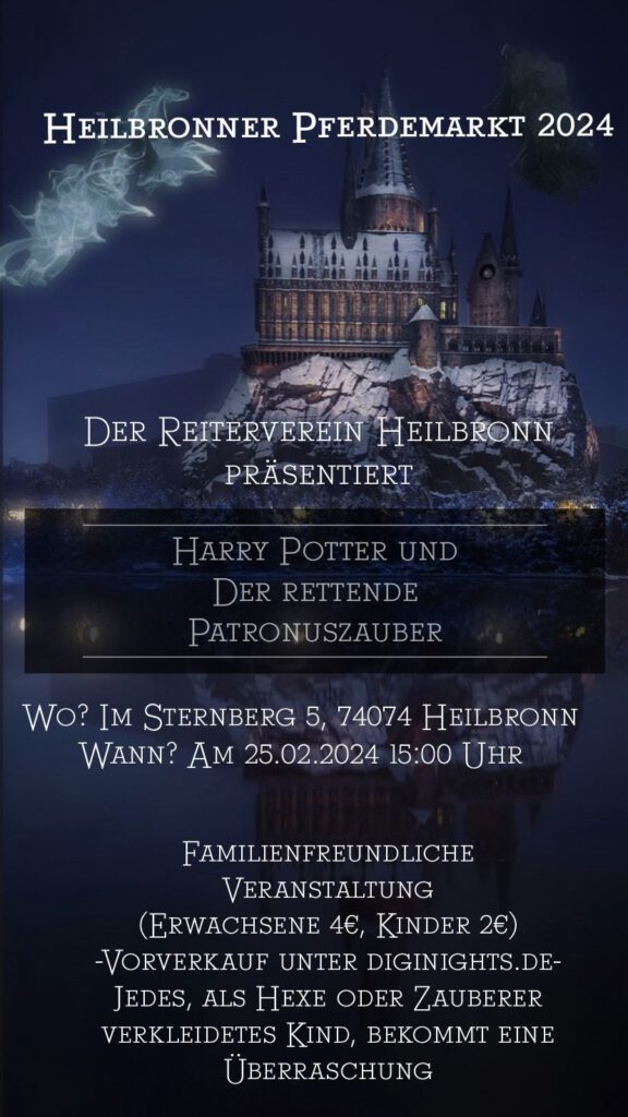 Pferdemarkt 2024 Veröffentlicht am Januar 25, 2024Januar 25, 2024 von Admin Tickets unter: https://diginights.com/ticket/2024-02-25-harry-potter-und-der-rettende-patronuszauber-reiterverein-heilbronn/step/1